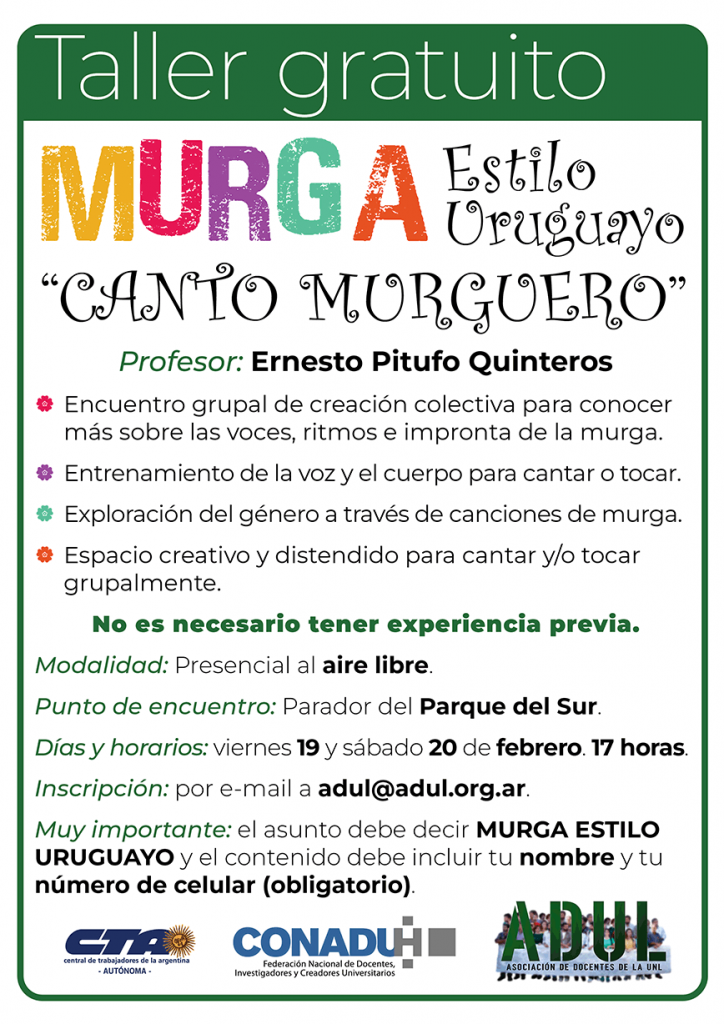A cargo del Profesor Ernesto Quinteros. Destinado a afiliados, familiares de afiliados y no afiliados de todas las edades. Consistirá en encuentros grupales de creación colectiva para conocer más sobre las voces, ritmos e impronta de la murga. Entrenamiento de la voz y del cuerpo para cantar o tocar. Exploración del género a través de canciones de murga. Espacio creativo y distendido para cantar y /o tocar grupalmente. No es necesario tener experiencia previa.