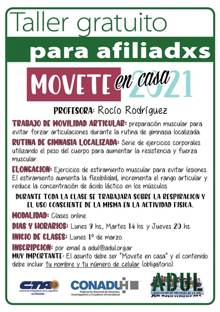 Inscripciones: adul@adul.org.ar / Asunto: «Movete en casa»
