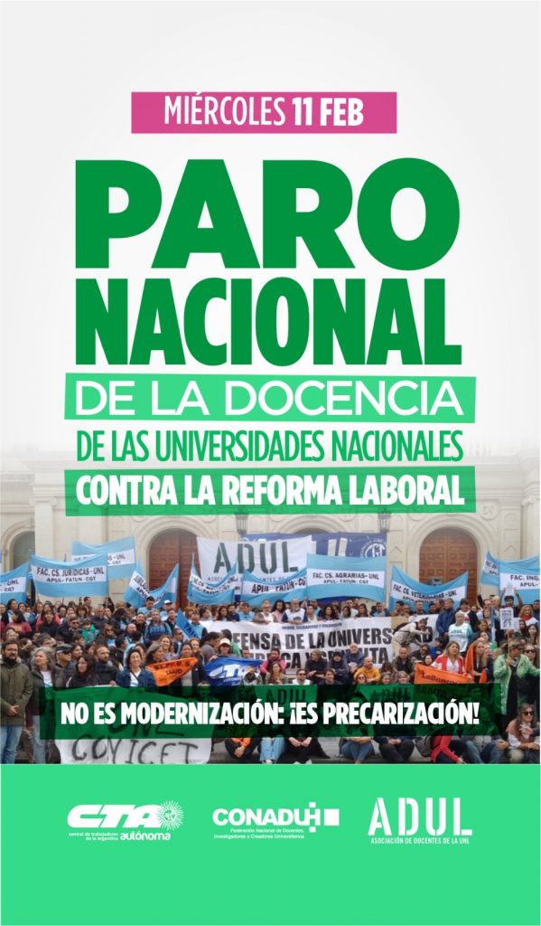 Este miércoles 11 de febrero vamos al Paro Nacional de la Docencia Universitaria convocado por la CONADU Histórica, para rechazar la Reforma Laboral impulsada por el gobierno nacional, que ataca derechos conquistados y que, de aprobarse, profundizará aun más la precarización del trabajo docente.