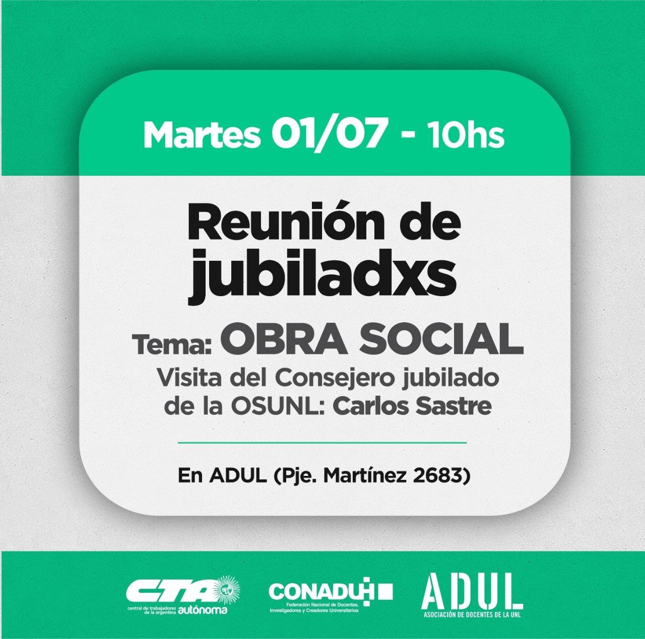 Compañeras jubiladas y compañeros jubilados: Nos visitará el consejero jubilado de nuestra Obra Social, Carlos Sastre. Entendemos que esta instancia es fundamental para plantear las necesidades de nuestro sector y, al mismo tiempo, generar una vía de tramitación de los problemas que van surgiendo. Los convocamos a esta importante reunión, que se hará en la Casa de ADUL, el martes 1ro de julio a las 10hs. Los esperamos, el compromiso colectivo es fundamental.
